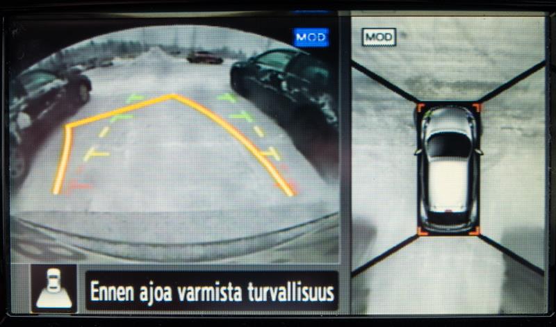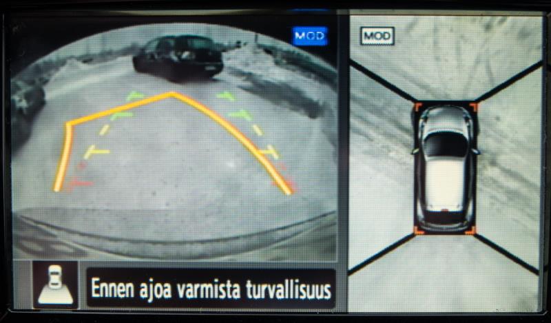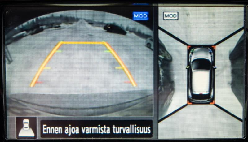 Auton peruutus ruutuun takakameran ja AVM-järjestelmän avulla. Paksu keltainen viiva näyttää, mihin auto kääntyy ratin nykyisellä asennolla.