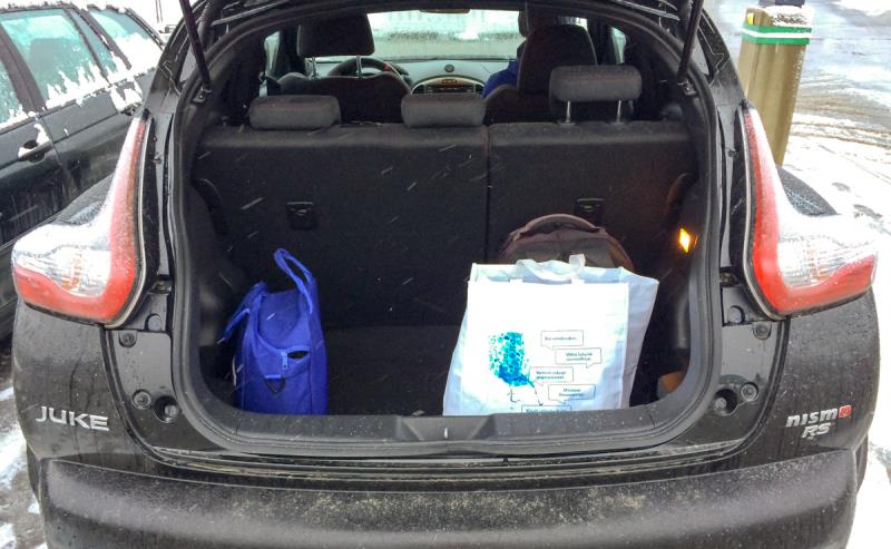 Viikonloppuna satoi ainakin kymmenen sentin ensilumi ja ajattelin, että nytpä pääsen testaamaan nelivetoa, kun sellainen edellisessä testaamassani Juke Nismossa oli. Pettymyksekseni sitä ei kuitenkaan ollut tässä yksilössä, sillä sen saa ainoastaan automaattivaihteiseen malliin ja tämä oli manuaali. Hyvitykseksi manuaalivaihteisessa mallissa oli nelikkoa syvempi takakontti. Nelivetoja tuntevammat varmaan osaavat kertoa, miksi näin, koska minulla ei ole mitään havaintoa.