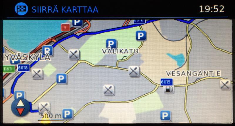 Tältä Jyväskylän keskustan pitää näyttää 500 m zoomaustasolla! Verrokkikuva Leonin navigaattorista.