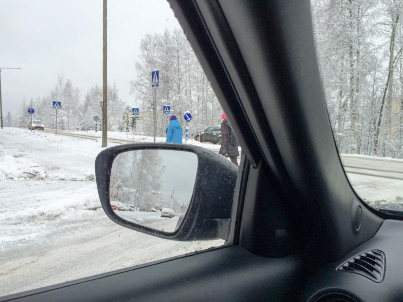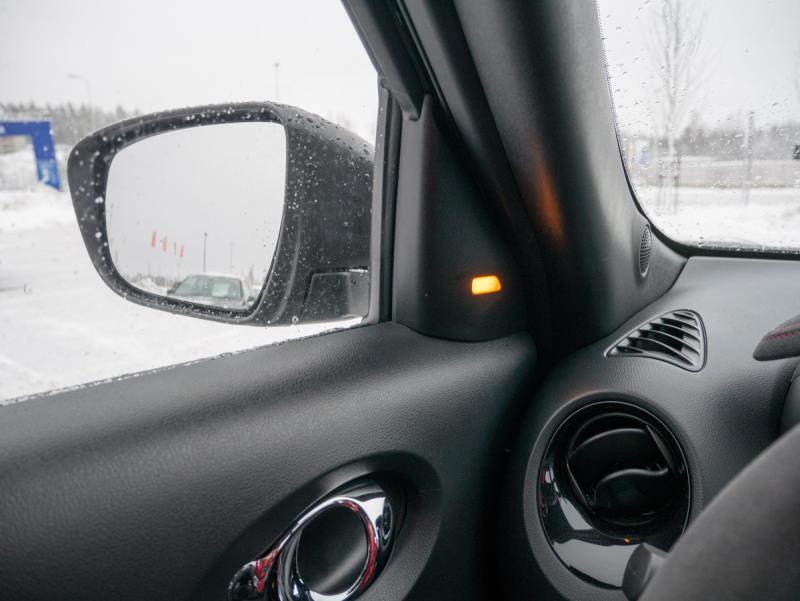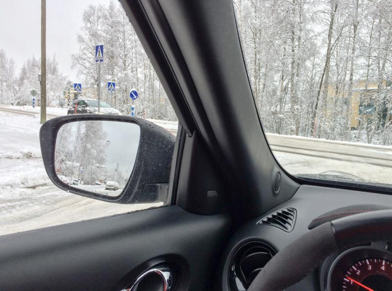 Tästä asiasta olen valittanut joka kerta, kun olen koeajanut Juken, mutta valitan taas: isot peilit ja paksu A-pilari muodostavat aikamoisen näkemäesteen. Toisin kuin viimeksi, en tällä kertaa meinannut ajaa niiden takia kenenkään päälle, mutta kyllä niiden takaa sai vähän kurkistella risteyksissä. Ja kuten seuraavasta kuvasta näkyy, autotkin meinaavat jäädä katveeseen. Kuvat on otettu ihan todellisesta tilanteesta, kun seisoin risteyksessä ja odotin omaa vuoroani liittyä päätielle.