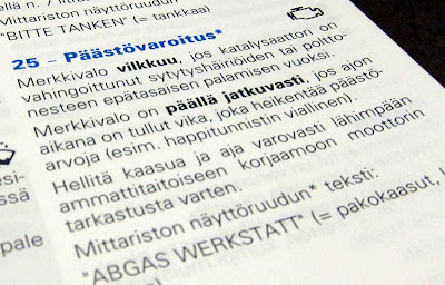 Soitin vielä kaverille jonka luokse olin menossa ja kokeilin sitten käynnistää auton vielä uudelleen, jotta tietäisin, uskallanko ajaa sillä vajaan kymmenen kilsan päähän huoltoon. Yllätyksekseni moottorin merkkivalo ei enää vilkkunutkaan, vaan paloi nyt koko ajan. Nytkyminen oli myös tiessään ja auto tuntui ihan normaalilta, kun kiersin sillä varovasti Ikean parkkipaikkaa. Ohjekirjan mukaan "Merkkivalo on päällä jatkuvasti, jos ajon aikana on tullut vika, joka heikentää päästöarvoja (esim. happitunnistin viallinen)."