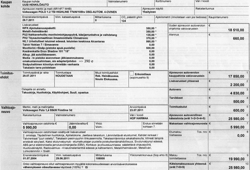 Osa Polon myyntisopimuksesta, josta näkyy kaikki tarjoukseen tehdyt viilaukset. Loppuhinnasta puuttuu Media-In-pistokkeen asennus, joka kustansi 390 e.
