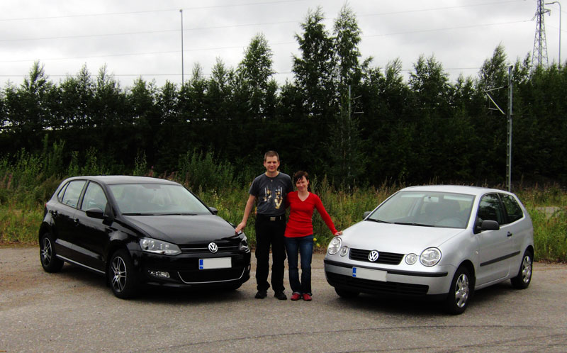 Esittelyn jälkeen nostelimme talvirenkaat Polon kyytiin (takapenkit menevät muuten tosi kätevästi kasaan) ja enää yksi asia oli hoitamatta: kuvata vanha Polo ja uusi Polo yhdessä. Olin kysynyt lupaa siihen itseasiassa jo tilaussopimusta allekirjoittaessamme. Muutaman sadan metrin päässä Keskisuomalaisen takana oli sopivan hiljainen tienpätkä, jossa oli sopiva paikka ajaa autot vierekkäin. Myyjä lähti mukaamme ja tarjoutui ajamaan autot puolestani levikkeelle juuri siihen asentoon kuin halusin. Kylläpä se kävi näppärästi! Loppuviimeksi myyjästä tuli vielä valokuvaajakin, kun halusin ottaa perhepotretin. :)