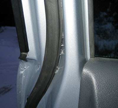 Myöhemmin esittelin irronnutta tiivistettä työkaverilleni, joka huomasi, että tivisteen liimaus pettää myös oven keskivaiheilla kohdassa missä alkaa ikkuna ja ovi kaareutuu. Näyttää siltä, kuin tiivistettä liimatessa olisi "vedettu mutka suoraksi", kuten työkaverini asian ilmaisi.