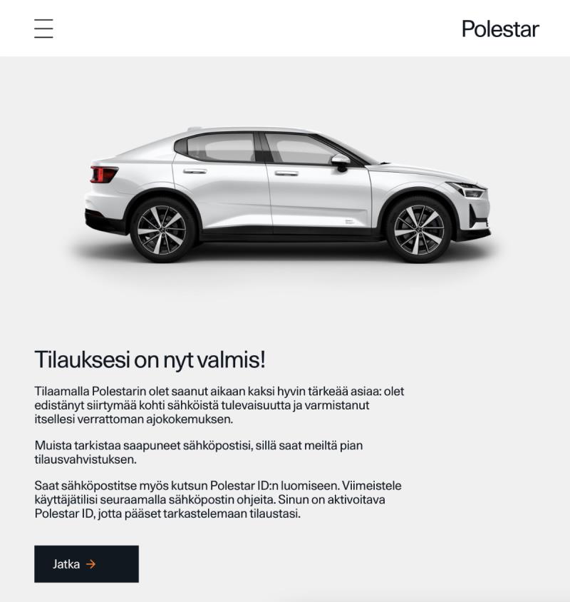 Polestar 2 tilaaminen netistä oli tosi helppoa. Osamaksun rahoitushakemuskin tehtiin tilauksen yhteydessä. Rahoituspäätös tuli sähköpostiin saman tien, kun hakemus oli laitettu vetämään.