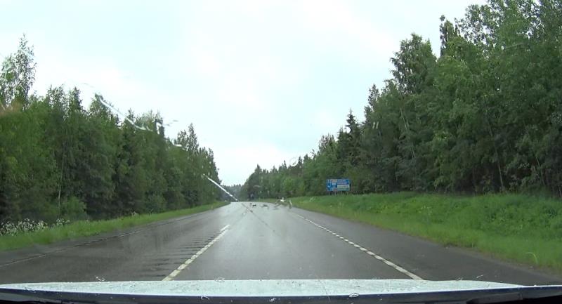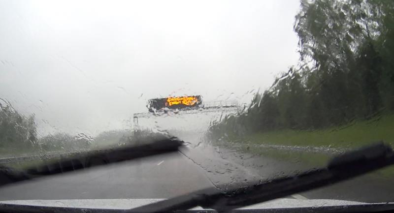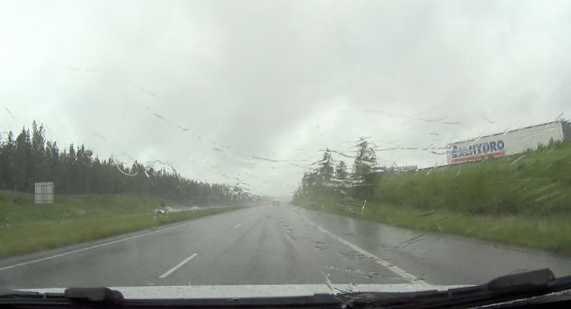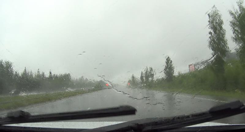 Moottoritiellä sade yltyi aivan totaaliseksi kaatosateeksi. Sopivasti myös tässä vaiheessa tulin siihen tulokseen, että olisi ajettava 100 km/h, jotta saadaan aikataulu kiinni, mutta sen sijaan nopeutta oli laskettava, koska moottoritie lainehti ja edes pyyhkijöiden maksimiteho ei kerennyt puhdistaa ikkunaa riittävän nopeasti. Totesin, että turvallisuus ennen kisaa, sytytin sumuvalon ja tyydyin ajamaan 80 km/h vaikka se aikataulua vähän uhkasikin.