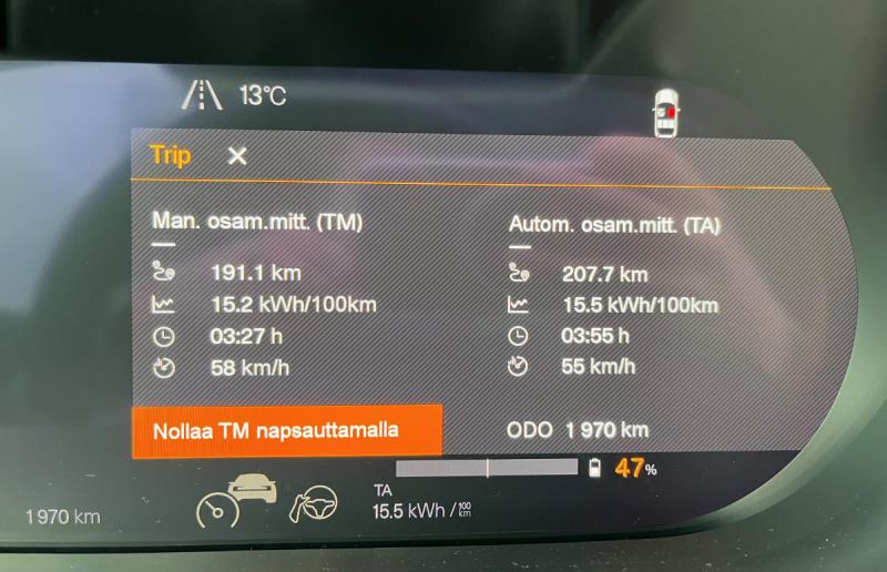 Varsin rauhallisen jakson keskikulutus oli 13,3 kWh/100km.
