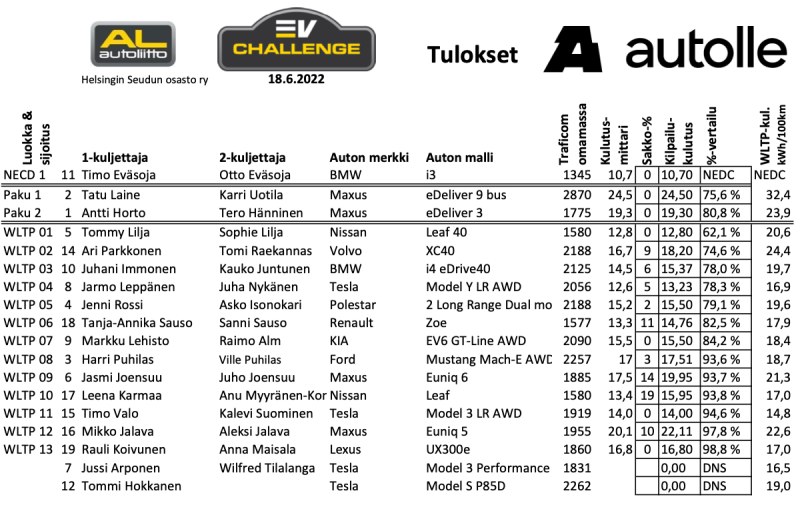 EV-Challengen tuloslaskenta on perustunut viime syksystä alkaen siihen, että autojen kisakulutuksia verrataan niiden WLTP-kulutuksiin ja se joka alittaa omansa suurimmalla prosenttiosuudella, voittaa.