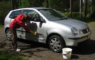 Yleensä olen pessyt auton järvivedellä, mutta tällä kertaa otin sisältä kuumaa vettä, koska pesuaine kuulemma toimii paremmin kuumassa vedessä. Kumihanskat olivat myös uusi keksintö. Vaikka toisessa hanskassa olikin yhdessä sormessa pieni reikä, oli peseminen silti paljon miellyttävämpää kuin ilman hanskoja.