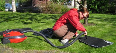 Kumimatot pesin vesiletkun päässä olevalla harjalla (+9-asteinen järvivesi on muuten kylmää!), sillä ne olivat melko rapaiset talven jäljiltä. Liekkimatot oli syksyllä kannettu varastoon sellaisinaan, joten harjasin niistä roskat pois takakonttiin unohtamallani lumiharjalla.