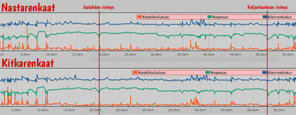 Testilenkki nastarenkailla ja kitkarenkailla ajettuna.