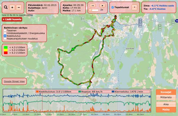 Ajoin kitkarenkailla lähtöä ja loppua lukuun ottamatta saman testilenkin kuin nastoillakin. Puolentoista tunnin ajon jälkeen fiilis oli hämmentynyt: näinkö helppoa tämä on? Olin odottanut, että auto tahtoisi luistella mutkaisella ja jäisellä tiellä ekaa lenkkiä enemmän, mutta takapuoleni ei huomannut luistoa kuin pari kertaa aavistuksen verran. Taisin kyllä tulla mutkiin vähän rauhallisemmin kuin nastarenkailla, mutta muuten ajelin Drivecon* perusteella aika samaa nopeutta kuin ekallakin lenkillä. Koko reissun keskinopeus oli vain kaksi kilometriä ekaa lenkkiä pienempi.
