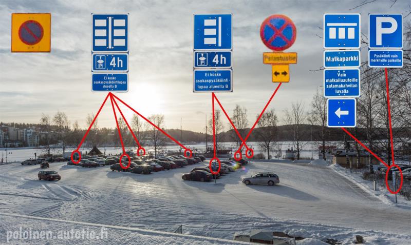 Mihin auton sitten saa pysäköidä? Noh, ensinnäkin ihan alueen reunaan saa pysäköidä vain matkailuautoilla. Sen jälkeen kentälle on merkitty on kolme kaistaletta, mihin auton saa jättää pysäköintikiekon kanssa neljäksi tunniksi. Kunkin kaistaleen molemmissa päissä on P-merkki, autojen pysäköintiasennon kertova kilpi ja lisäkilvet, jotka kertovat, että pysäköidä saa 4 h kiekolla tai vapaasti asukaspysäköintilupa B:llä. Matkailuautoparkin jälkeiseen kohtaan saa laittaa vain yhden rivin autoja, mutta sitä seuraaviin kohtiin autoja saa pysäköidä kahteen riviin.