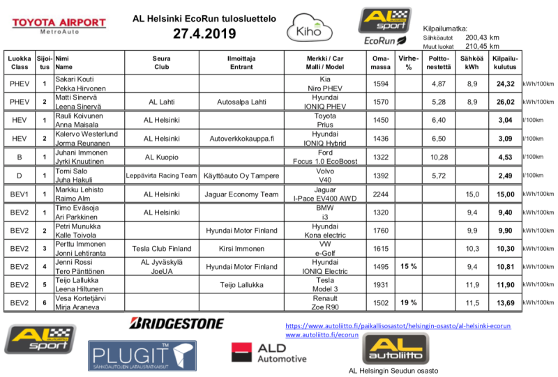 AL-Helsinki Ecorunin tulokset. Sähköautojen kulutukset on katsottu suoraan autojen ajotietokoneista.