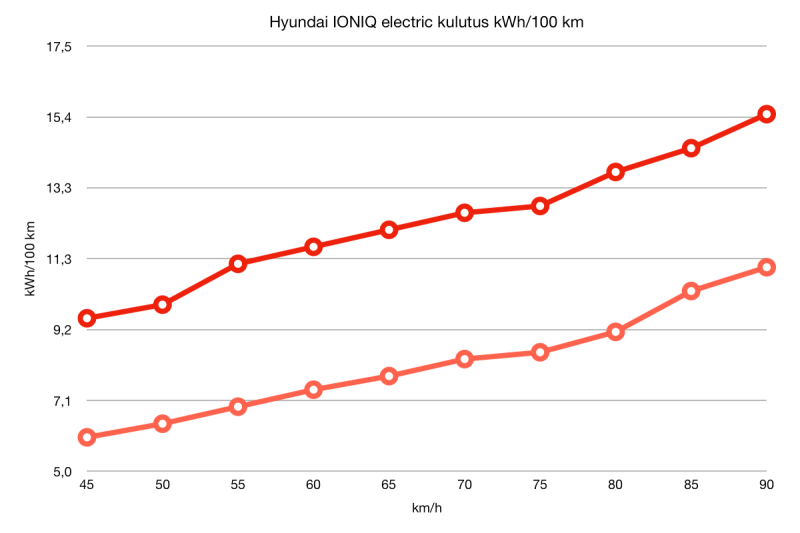 Sähköautossa pystyy testaamaan vain, miten nopeus vaikuttaa kulutukseen. Ajoin IONIQilla samaa 700 m jaksoa eri nopeuksilla 45-90 km/h väillä niin, että asetin vakionopeussäätimen joka kerta 5 km/h edellistä suuremmaksi. Olen polttiksilla tottunut, että kulutuskäyrä nousee sitä jyrkemmin, mitä kovempaa ajaa, mutta sähköautolla kulutuskäyrä oli lähes suora. Tästä päättelin että kilpailu pitäisi ajaa niin hitaasti kuin mahdollista.