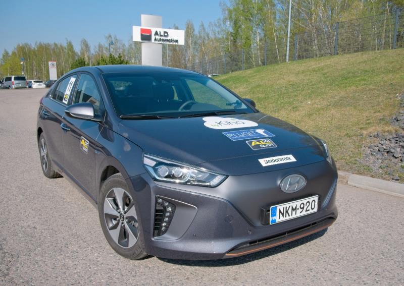Hyundai IONIQ electric kilpailukuosissa. Kilpailulle oli saatu mukavasti sponsoreita: ajoneuvojen seurantajärjestelmä Kiho, sähköatojen latausratkaisuja tarjoava Plugit sekä rengasvalmistaja Bridgestone.
