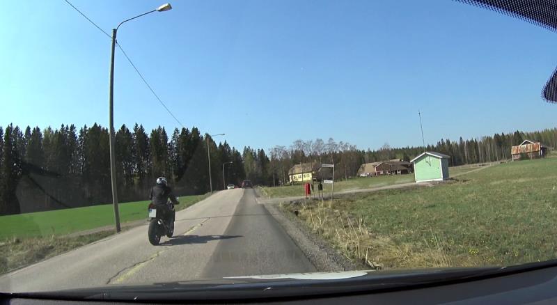 Ja moottoripyörä perässä vastaantulijoiden nenän edestä.