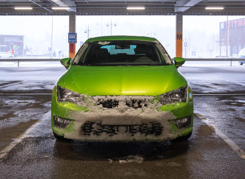 Olin ajatellut pitä tauon Vierumäen Matkakeitaassa, mutta räntäsade muutti suunnitelmia. Auto oli kevään rapakeleistä niin törkeä likainen, että ei tulisi kuuloonkaan, että tauon jälkeen kävisin harjailemaan siitä lumia pois. Niinpä kurvasinkin tauolle Lahden Kauppakeskus Karismaan, jossa auton sai tauon ajaksi mukavasti parkkihallin suojaan. Auton puskuri oli kerännyt päälleen monen sentin loskakuorrutuksen, joka oli niin tiivis, että se ei inahtanutkaan, kun tökin sitä vähän lumiharjalla rekisterikilven kohdalta...