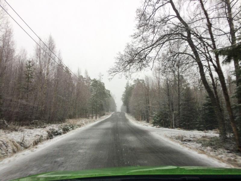 Heinolan jälkeen siirryin moottoritieltä normaalille maantielle, jolla matkanteko hidastui entisestään. Turvalliselta tuntui ajaa enintään 60-70 km/h. Liikennettä oli selvästi motaria vähemmän, eivätkä ajourat olleet enää yhtä sulat. Onneksi ei sentään ollut pakkasta!