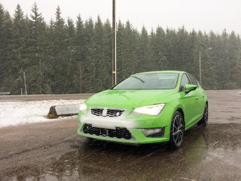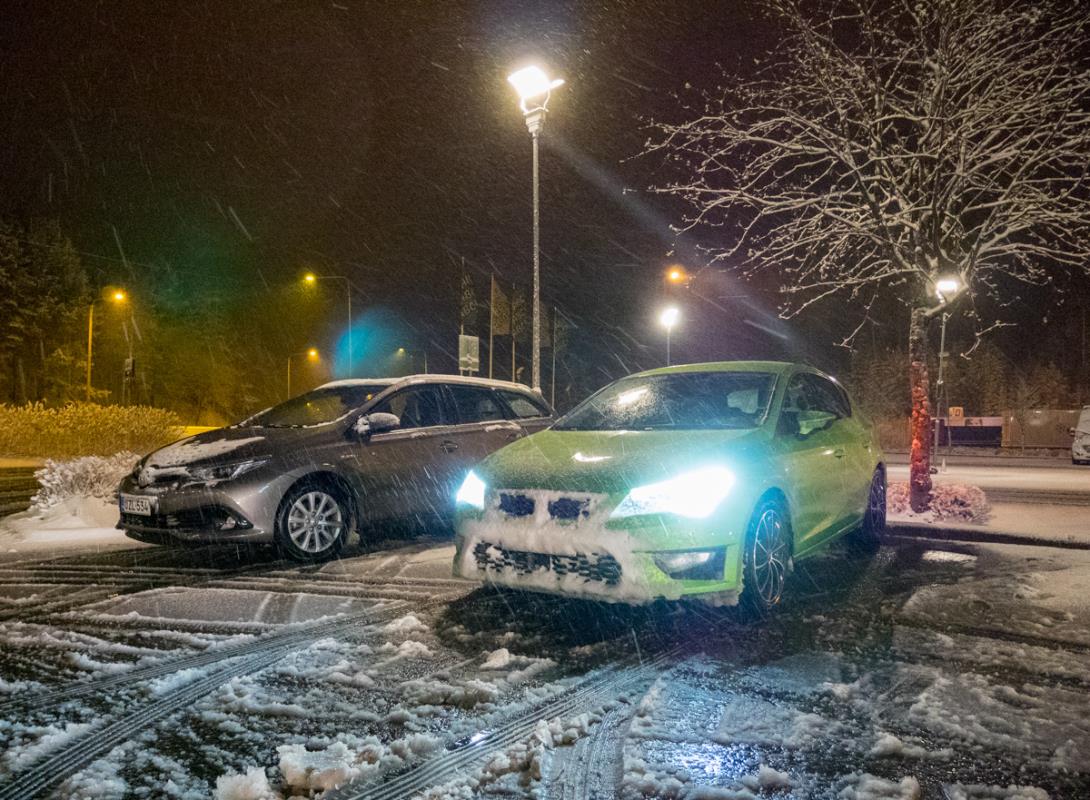 Puolivälin jälkeen taivaalta alkoi tulla räntää, mutta en antanut sen häiritä. Ajettuamme 2/3 reitistä oli kuitenkin pakko alkaa huomioida muuttunut keli, sillä räntä alkoi jäädä maahan ja mutkissa alkoi olla vaara, että auto lähtee luistelemaan. Seuraavalla tauolla autoa oli jo puhdistettava lumesta, sillä etututka ja rekisterikilpi olivat muurautuneet umpeen ja pyhkijät tampanneet tuulilasin reunaan tiiviin kerroksen lunta. Onneksi lumiharja oli vielä mukana!
