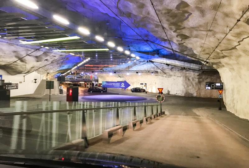 Pysäköintihalli on poikkeuksellisen avara, sillä sen kerrokset eivät yhdisty umpinaisilla luiskilla, vaan se on yksi suuri luola, jossa on kaksi kerrosta ja alempaan näkee kaiteen takaa. Keskellä komeutta on jopa liikenneympyrä!