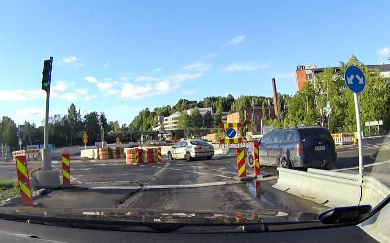 Uusintakierros. Kun tarkkaan katsoo, keskellä risteystä on kahteen suuntaan jakava nuolimerkki. Kuvasta huomaa myös ajoratamaalaukset, jotka sekoittuivat kadun jyrsintöihin.