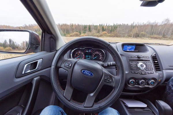 Wildtrak oli toinen pick-up, jolla olen ajanut. Eka oli Amarok, jolla ajeltiin metsässä viime talvena Volkswagen hyötyautojen talviajokoulussa. Ihan vastaavaan maastoon Aki ei mua valitettavasti vienyt Wildtrakillaan, mutta pääsin sentään ajamaan pellolla, mikä sekin oli varsin hauskaa. Aki tosin taisi olla hieman kauhuissaan huomatessaan millainen peltokaahari rauhallisen poloisen kuoren alta paljastuikaan… Minussa oli kuulemma miehekkäitä piirteitä! Olen liikenteessä rauhallinen ja turvallisuudesta huolehtiva kuski, mutta kun tilaa oli, niin mikäs siinä päästellessä. Sama pätee rampeilla kiihdytyksiin. Talla pohjaan ja menoksi, sillä pitäähän autosta nyt testata, miten se kulkee.