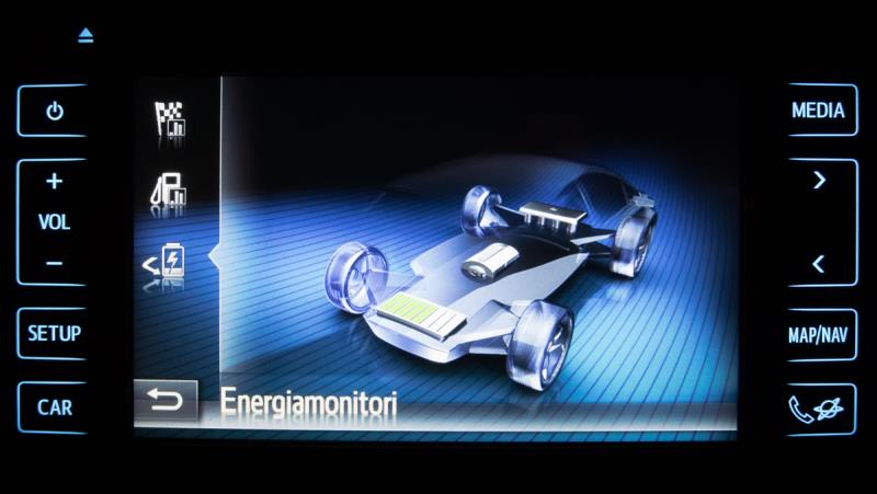 Toyota Auriksen energiamonitorissa akun varaustila vaihtelee yhden ja kahdeksan palkin välillä.