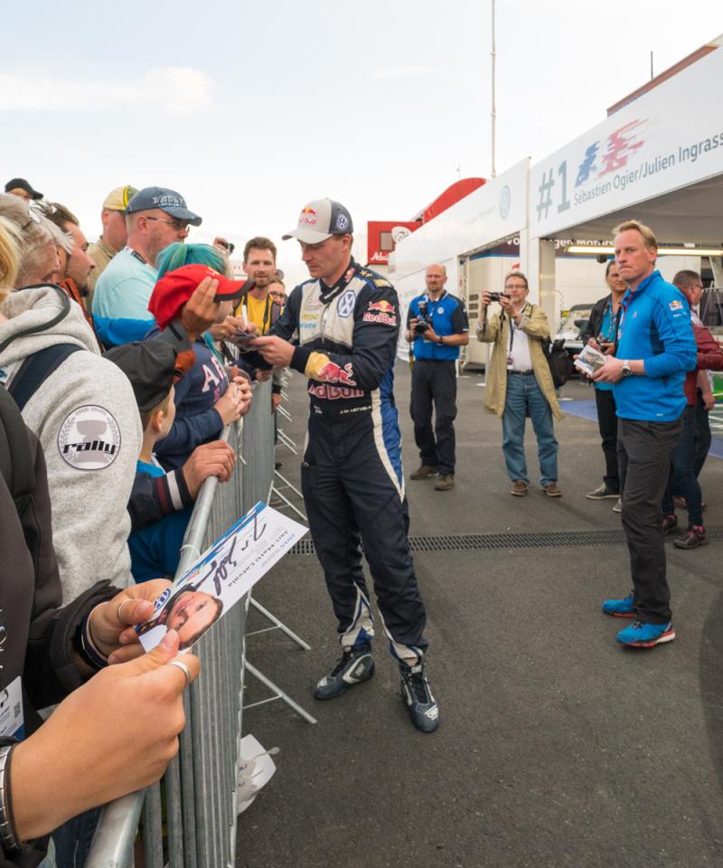 Kaiken kaikkiaan seisoin aidan vieressä kolme tuntia, mikä kuulostaa aika paljolta, mutta meni nopsaan. Koko illan seisoskelu kyllä kannatti, sillä huollon alkaessa Latvala tuli jakamaan nimmareita ja nyt mulla onkin työpaikan Volkswagen-seinällä Polo WRC:n kuva Jari-Matin nimmarilla varustettuna!