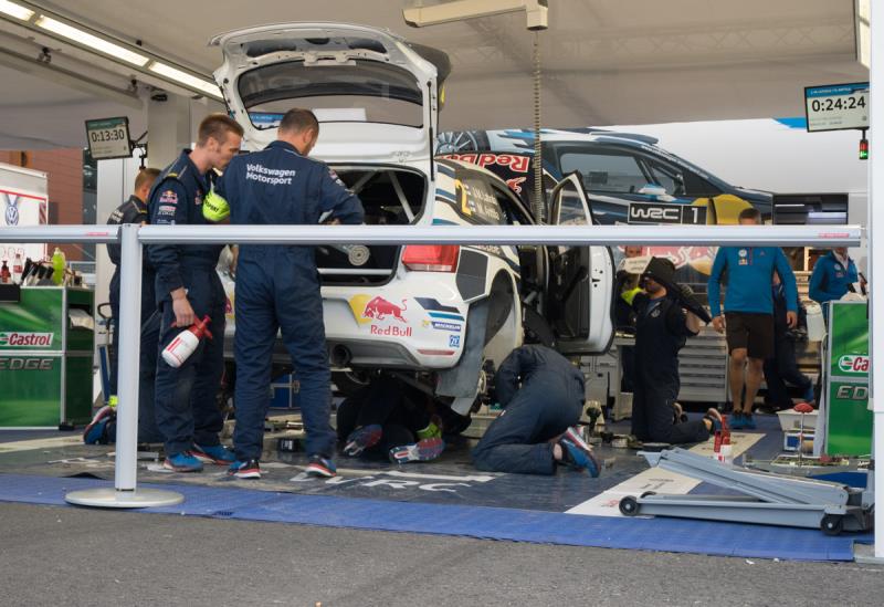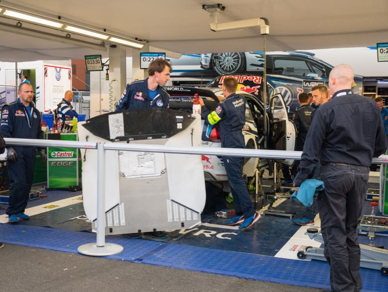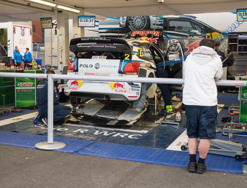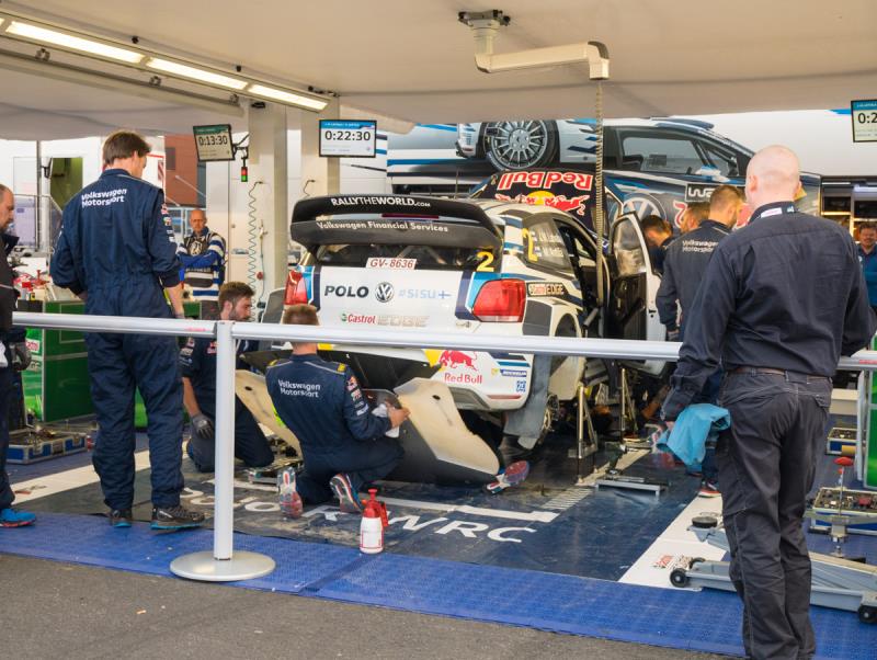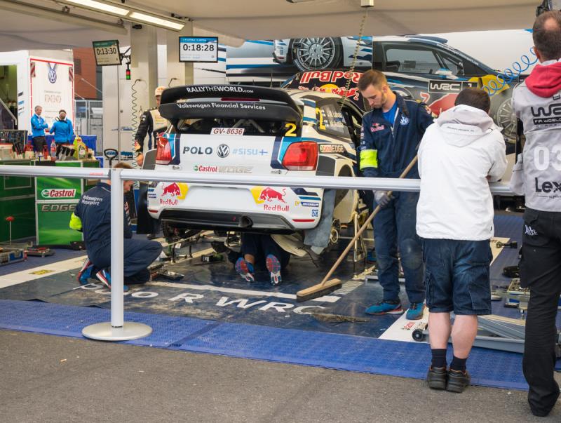 Ogier ja Latvala tekivät hienot sisääntulot pilttuisiinsa ja oli siistiä autot ihan eturivistä. Keskeyttämään joutuneen Mikkelsenin pilttuu oli suljettu tarkkaan pressulla. Olisi ollut kiinnostavaa nähdä, mitä siellä tehtiin, sillä kovasti sieltä kuului kaikenlaisia askartelun ääniä.