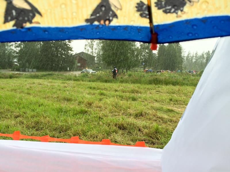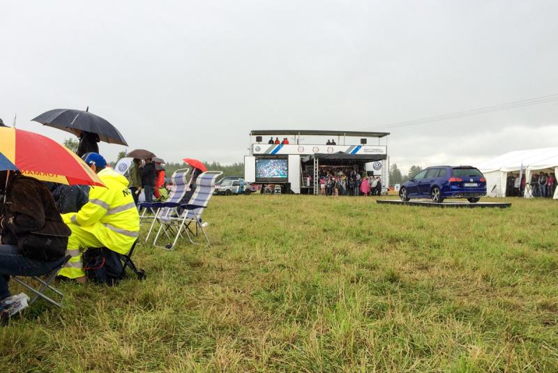 Parikymmentä minuuttia ennen Jukojärvi 2 alkua taivas alkoi synketä uhkaavasti juuri ennen EK:n alkua vettä alkoi tulla kaatamalla. Suuri osa katsojista vetäytyi telttakatokseen, mutta kovimpia faneja edes kaatosade ei karkottanut parhaimmilta katsomopaikoilta aidan vierestä. Ei myöskään minua, vaan istuin sateenvarjon alla kuin tatti ja puristin tiukasti reppuani, jotta läppäri ei vain kastuisi. Kannustamisemme palkittiin: kun Latvala ajoi Volkswagen-katsomon ohi, hän ehti vielä kelistä ja vauhdista huolimatta vilkuttaa meille. Tai ehkä Se oli Miika, mutta kummiskin. :)