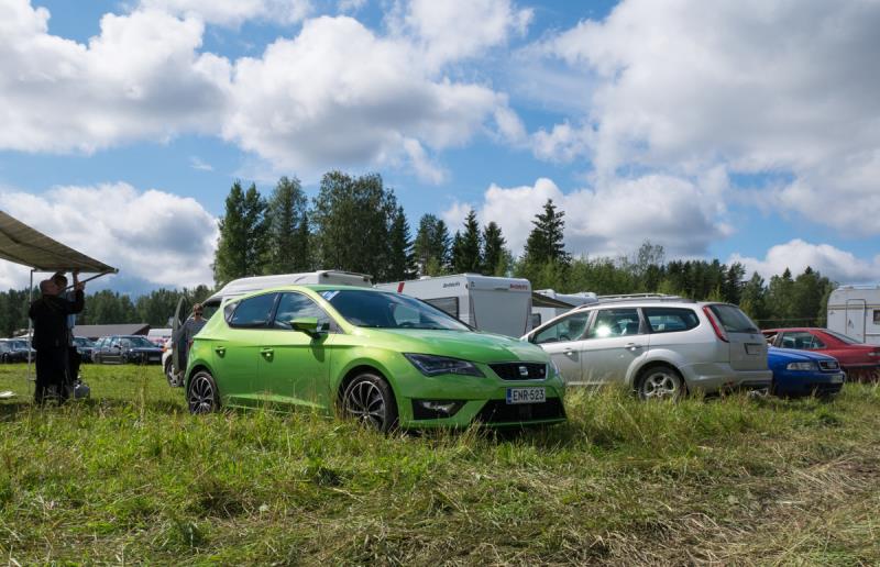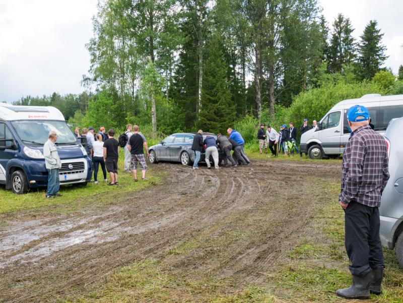 Tärkeimpien luokkien ajettua ajattelin lähteä kotiin, mutta niin olivat ajatelleet monet muutkin ja peltoparkista poistuminen oli ruuhkautunut. Pelto oli muuttunut sateen seurauksena mutavelliksi, johon etenkin asuntoautot jäivät kiinni. Monet henkilöautotkin tarvitsivat työntöapua, kun taas nelivedot ylittivät mutaesteen kadehdittavan helposti. Niinpä palasin suosiolla katsomaan erikoiskoetta.