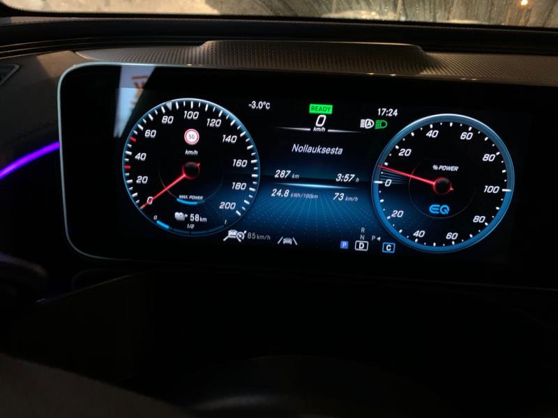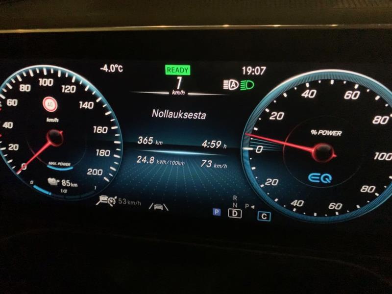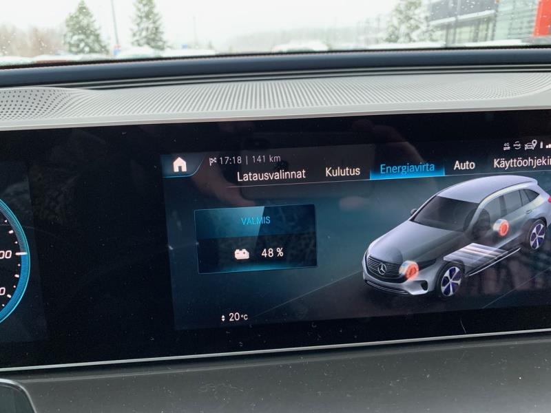 Matkan jatkuessa ilta hämärtyi säkkipimeäksi, jolloin Mersun matriisi-LED -valoautomattiikka pääsi oikeuksiinsa. EQC400:ssa on suvereenisti parhaat ajovalot, joilla olen koskaan itse päässyt ajamaan. Ne valaisevat tien todella tehokkaasti ja riittävän pitkälle. Kaukovaloautomattiikka hoituu siten, että vain vastaantulijoita häiritsevät valonsäteet estetään, jolloin tien oikea reuna pysyy pitkälle kirkkaana. Lievä haitta näin hyvistä valoista on se, että kovin usein vastaantulijat kuvittelivat minun ajavan pitkillä päin, vaikka automatiikka toimi aivan oikein.
