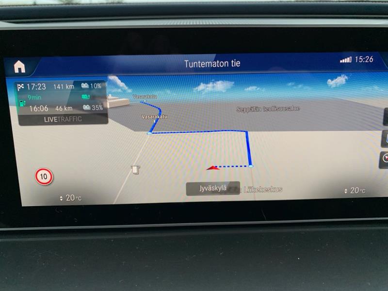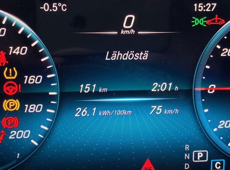Kello 15.26, eli noin 15 minuutin latauksen jälkeen starttasimme Mersun jälleen kohti pohjoista. Akussa oli tuolloin 57% varaustaso ja toimintamatkaa auto lupasi 151 kilometriä, joka riittäisi hyvin 141 kilometrin taittamiseen Pihtiputaalle asti.