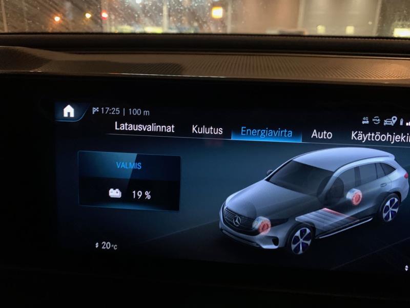 Otimme yhteikokoontumisen Tampereella Turtolan K-lataukselle. Matkaanlähtöä suunnitellen ja kaikkien paikalle pääsyä odotellessa MB EQC400 -sähköauton akku ehti latautua 100% tasolle.