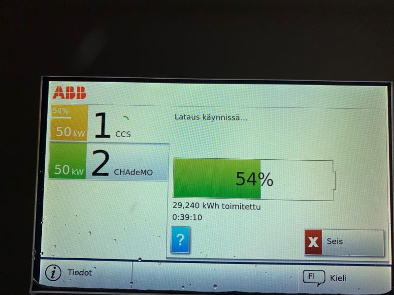 Kärsämäeltä matka jatkui kello 19.34, eli 27 minuutin lataustauon jälkeen akun varaustilan ollessa 49%, joka riittäisi hyvin perille Oulun Kaakkurin Citymarketin K-lataukselle asti.