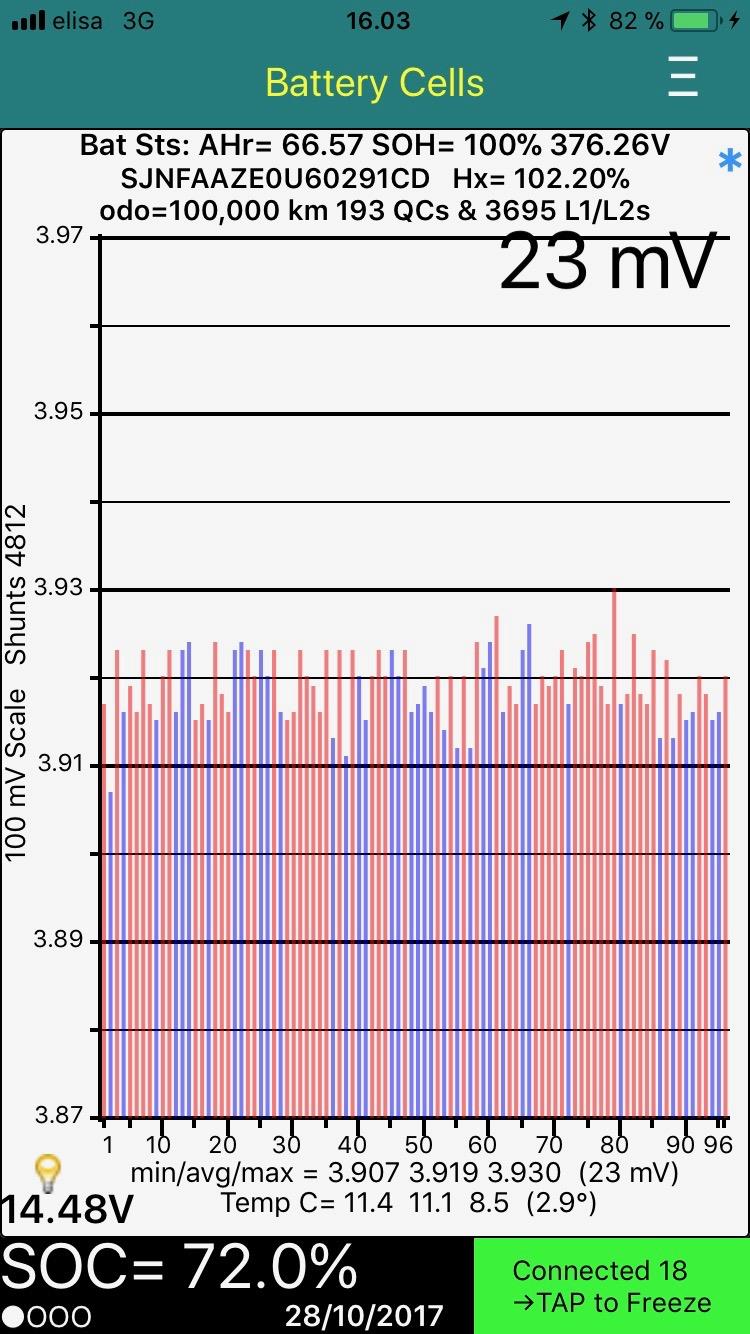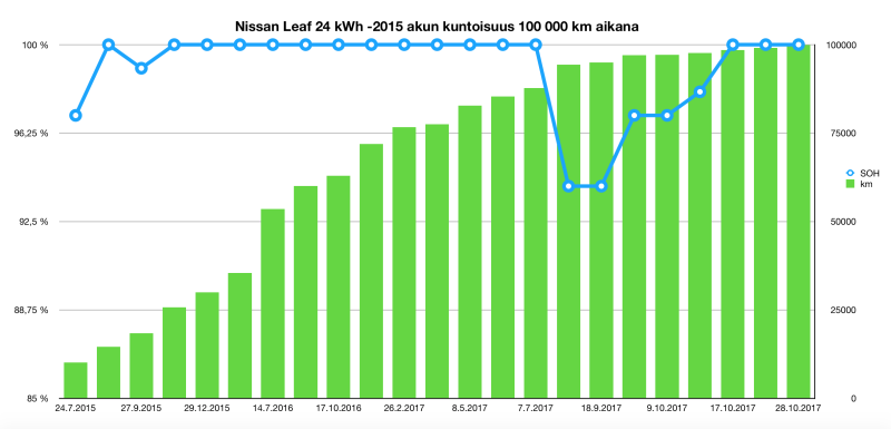 Akun kuntoisuudessa (SOH%) oli noin 95 000 kilometrin kohdalla hetkellinen notkahdus jopa 93% tasolle, mutta muutaman tuhannen kilomettin aikana lukema palautui takaisin 100-tasolle. Luultavimmin tuossa kohdassa muutaman kennon balanssointi ei toiminut hetkellisesti syystä tai toisesta riittävän hyvin, mutta ne ovat nyt siis palautuneet takaisin käyttöön.