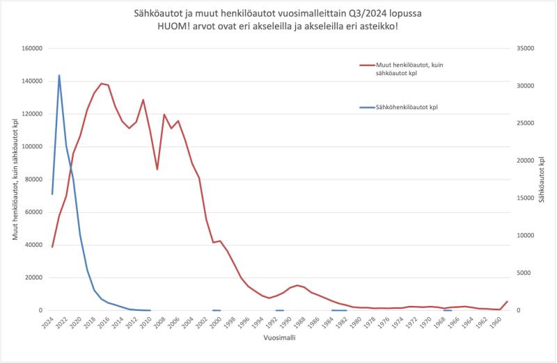 Tieliikennekäytössä olevat sähköautot ovat pääosin edelleen erittäin uusia verrattuna muilla liikenne-energioilla kulkeviin henkilöautoihin. Sähköautoissa korkein vuosimallien piikki on vuosimallissa 2021 ja sitä uudemmissa, kun muilla liikenne-energiolla kulkevissa autoissa korken piikki on vuosimallien 2006 ja 2017 välillä. Muilla liikenne-energioilla liikkuvien henklöautojen kuvaajasta myös näkee selkeästi missä iässä autoja alkaa päätyö tieliikennekäytöstä poistoon enenevässä määrin, eli vuosimallista 2006 alkaen, siis noin 18 vuoden iässä alkaa autojen määrä jyrkästi laskea.
