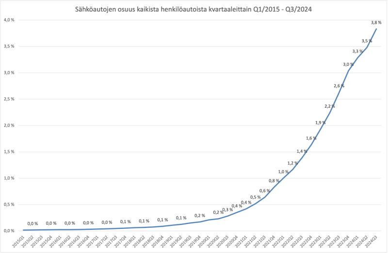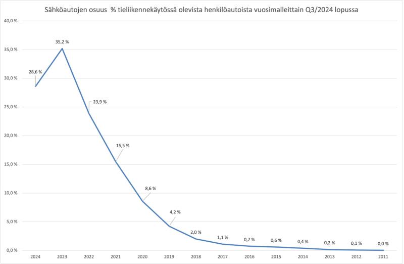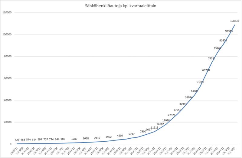 2024 Q3 lopussa Suomessa oli sähköhenkilöautoja tieliikennekäytössä jo yli 100 000 kappaletta