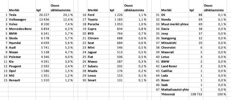 Tesla on edelleen sähköautomerkeistä yleisin Suomessa. Niitä oli kvartaalin lopussa tieliikennekäytössä Suomessa 26 227 kappaletta, eli 24 prosenttia kaikista sähköhenkilöautoista.