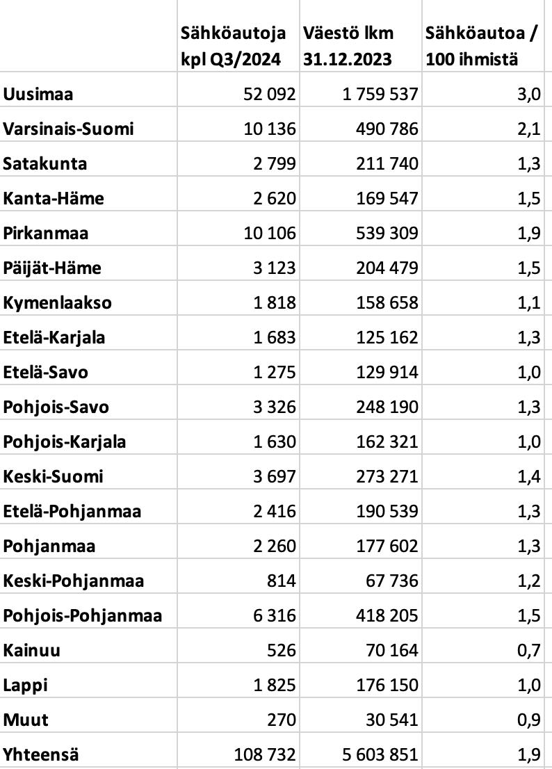 Sähköautotiheys asukasta kohden Suomessa on jatkanut myös nousuaan. Q3/2024 lopussa Suomessa oli 1,9 sähköhenkilöautoa sataa asukasta kohden, kun lukema vuotta aiemmin oli 1,3. Nyt manner-Suomen maakunnista enää Kainuussa oli sähköautotiheys alla yksi sataa asukasta kohden.