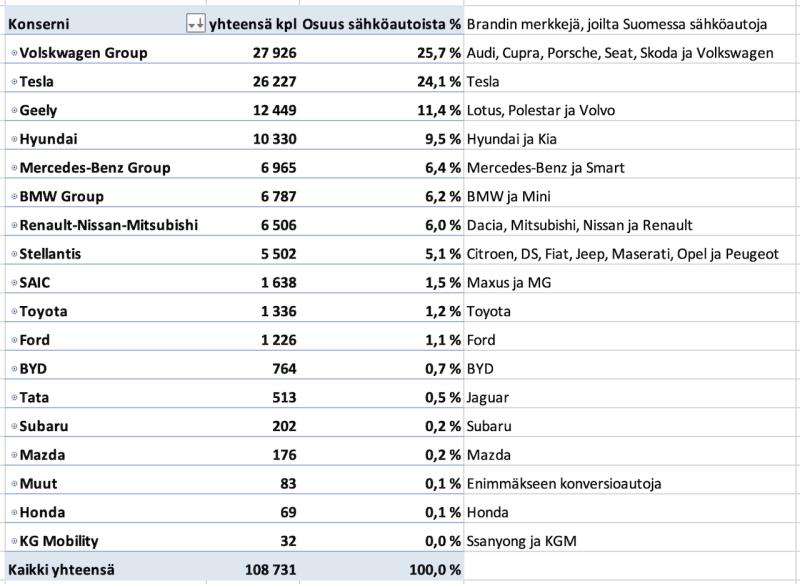 Autojen valmistus on viime vuosina keskittynyt voimakkaasti suuriin konserneihin. Tein pitkästä aikaa tilaston valmistajakonserneittain Suomessa tieliikennekäytössä olevista sähköuatoista. Volkswagen Groupin sähköautoja on eniten. Tesla on hyvä kakkonen omalla ainoalla merkillään. Stellantis puolestaan on laajasta merkkitarjoomasta huolimatta melko vähän Suomessa esiintyvä.