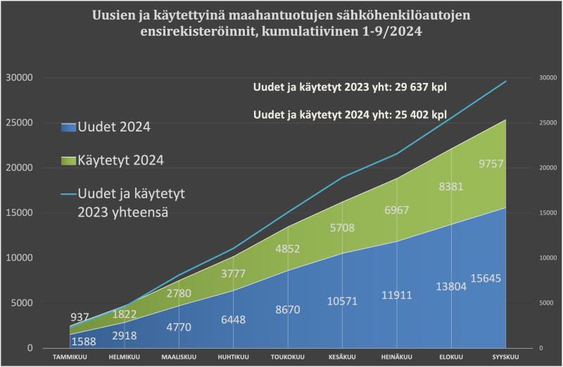 Vuosi 2024 on ollut matalien rekisteröintimäärien aikaa uusilla henkilöautoilla Suomessa. Myös sähköautojen ensirekisteröinnit vuoden alusta alkaen ovat jääneet viime vuoden alapuolelle. Tästä huolimatta tammi-syyskuussa 2024 on Suomessa ensirekisteröity jo 25 402 sähköhenkilöautoa lisää joko uusina tai käytettyinä maahantuotuina. Se on kuitenkin 14,3 % vähemmän kuin viime vuonna vastaavana aikavälinä.