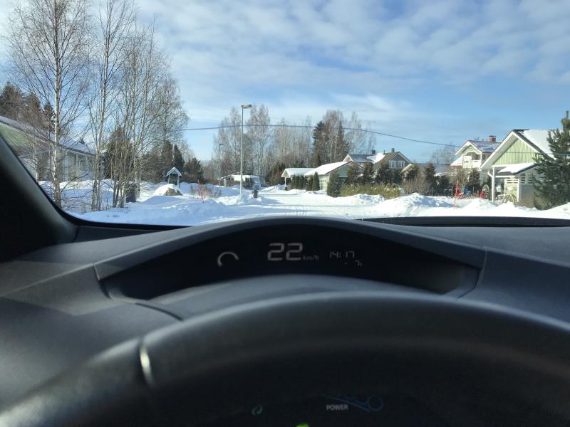 Lähdin Kangasalan Sahalahden kodista liikenteeseen kello 14.17 ja keli sattui olemaan hyvin samankaltainen kuin kaksi vuotta sitten, eli aurinkoinen pikkupakkanen. Ei siis lainkaan paha Leafin lämmitysenergian kulutuksen kannalta. Lähtiessäni akku oli 97% latautunut edellisistä aamupäivän ajoista ja auto oli sisältä hyvn esilämmitetty. LeafSpy paljasti, että akussa oli energiaa 21,2 kWh, kun parhaimmillaan täydelle akulle on näkynyt jopa noin 22 kWh:n lukemia.