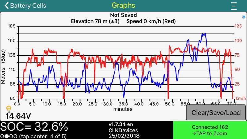 Alla olevassa kuvassa näkyy reitin kotoa Jämsään nopeus- ja korkeuskäyrät. Nopeuden punainen käyrä osoittaa hyvin, että mutkaisella maaseututiellä oli käytettävä alhaisempaa nopeutta. Sinisestä korkeuskäyrästä näkee selkeästi kuinka korkeat mäet on E63-tiellä on vähän ennen Jämsää. Ne mäet useiden kymmenien ajokertojen kokemuksella syövät 24 kWh Leafin akun prosentteja todella hanakasti.