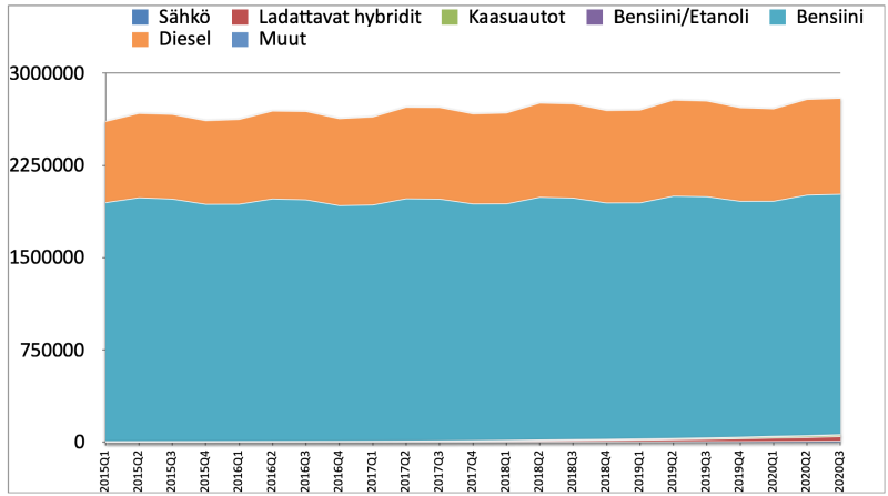 Koko automassaa katsottaessa sähköautojen ja lataushybridien määrät ovat edelleen niin marginaalisia, ettei niiden osuutta tahdo edes nähdä kaikkien liikennekäytössä olevien autojen määrän kuvaajasta. Tilanne kuitenkin muuttuu kiihtyvällä tahdilla kohti sähköisempää liikennettä, vaikka ajoneuvokannan muutos hyvin hitaalta tuntuukin uusien rekisteröintimäärien muutokseen verrattuna.