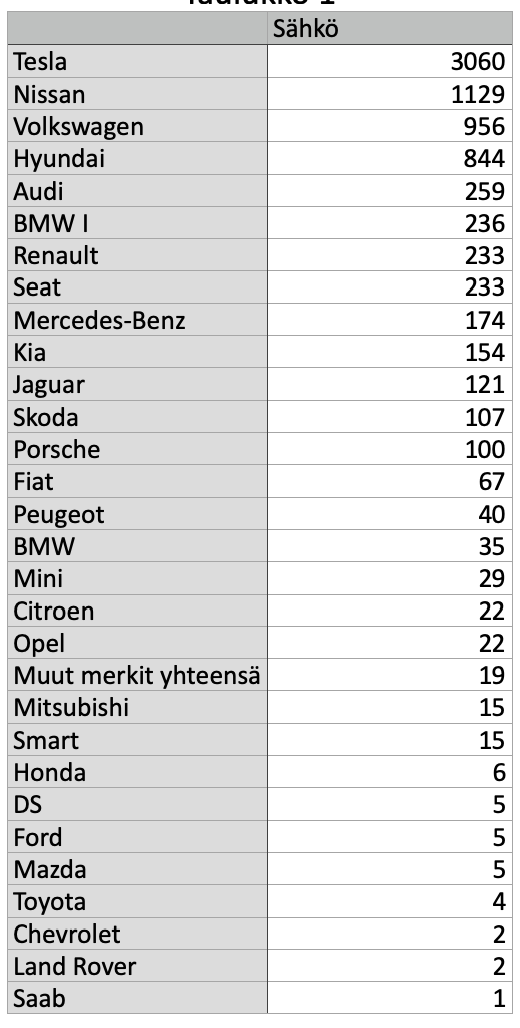 Sähköautoista 3060 kappaletta on Tesloja, eli ylivoimaisesti suurin osa, peräti 39% kaikista sähköautoista. Toiseksi yleisin sähköauto teillämme on Nissan, mutta Volkswagen tulee melkoisella varmuudella ottamaan toisen sijan vielä tämän loppuvuoden aikana nostamalla 956 määräänsä niin voimallisesti uuden ID.3-mallin toimitusten myötä.