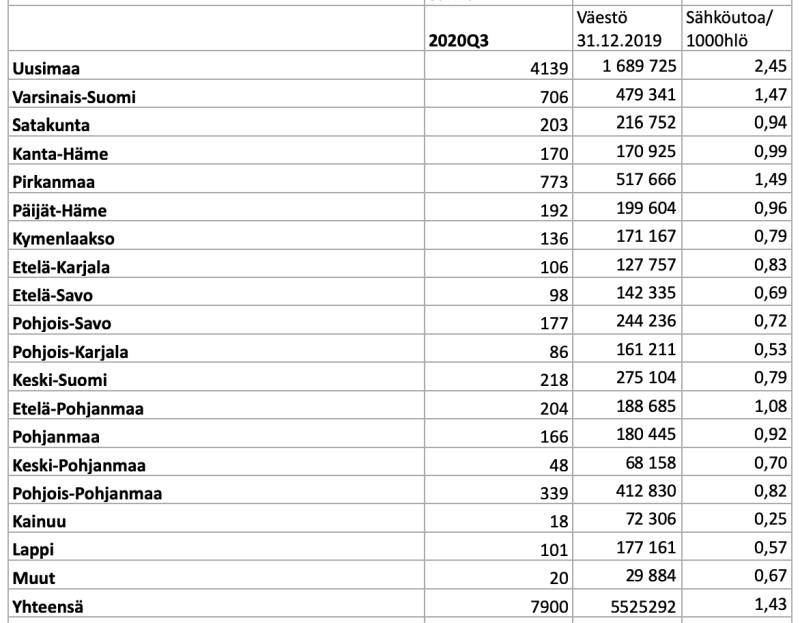 Eniten sähköautoja on edelleen Uudellamaalla, Pirkanmaalla ja Varsinais-Suomessa lukumäärältään ja suhteessa asukaslukuunsa. Myös etelä-Pohjanmaan 1,08 kpl/1000 henkilöä on mielestäni maininnan arvoinen suoritus.