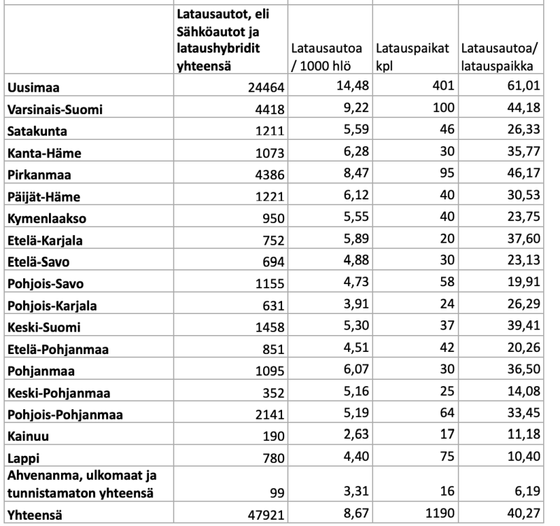 Lisäsin tästä johtuen edellisessä kappaleessa käyttämääni taulukkoon lähdetiedoiksi vielä lataushybridien ja latauspaikkojen määrät maakunnittain. Sähköautojen määrä + lataushybridien määrä on käytännössä latausautojen kokonaismäärä. Latausautojen kokonaismäärällä laskettuna Suomessa on 40,27 latausautoa yhtä latauspaikkaa kohden. Onneksi useissa latauspaikoissa on useampia latauspisteitä, joten tilanne on pääosin hyvin tasapainossa.