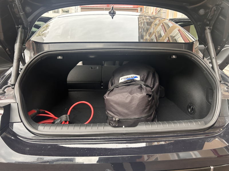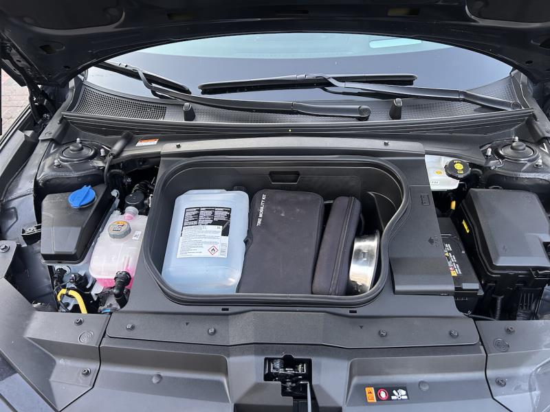 Takavetoisessa versiossa on edessä 45 litran tavaratila. Se on käytännössä hyvä lisätila ja sijoitin itse sinne 3-vaiheisen isokokoisen matkalatauslaitteen, auton alkuperäisen renkaanpaikkauspaketin, joustavan hinausköyden, kuormansidontaliinat, käsisammuttimen, V2L-adapterin sekä kolme koirien ruokakuppia. V2L mainittuani totean, että myös auton matkustamosta, takajalkatilan seinämästä löytyy 230V pistorasia, minkä suurin tehon anto on 3,6 kW. Itselleni tuolle sisällä olevalle pistorasialle on usein käyttöä, koska työni luonteeseen liittyen teen usein pitkiäkin Teams-palavereita matkan varrelta parkista autossa istuen. Lisäksi tulevan kesän Euroopan matkasuunnitelmiin kuuluu 230V ja 2000W tehoinen induktioliesi, vedenkeitin ja muuta sopivaa matkatarpeistoa, millä saa mukavaa joustoa reitin varrella vaikka aamupalan valmistamiseen.